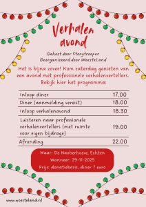 De verhalenavond begint om 7 uur en duurt tot 10 uur. De avond wordt gehost door Storytrooper, onder andere bekend van de grand pillow society verhalenavonden in de grand theater in Groningen.
