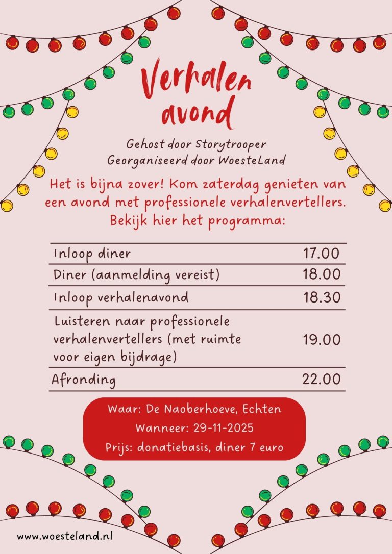 Wie wil kan voor de verhalen mee-eten met de WoesteLanders die deze avond mede mogelijk maken (8 euro). Wil je mee-eten? Reserveer dan nu, er is beperkt plaats. Het eten is vegetarisch en zoveel mogelijk ingrediënten komen natuurlijk van de Naoberhoeve zelf.
